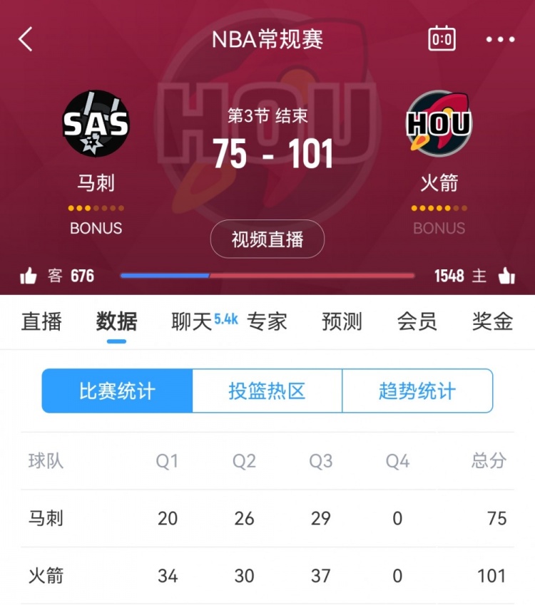 2月27日訊 NBA常規(guī)賽,火箭三節(jié)結(jié)束101-75領(lǐng)先馬刺。