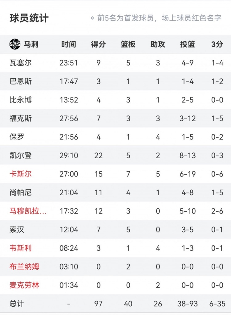 本場(chǎng)比賽,馬刺首發(fā)球員均表現(xiàn)低迷、沒(méi)有人得分上雙。具體如下: