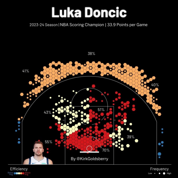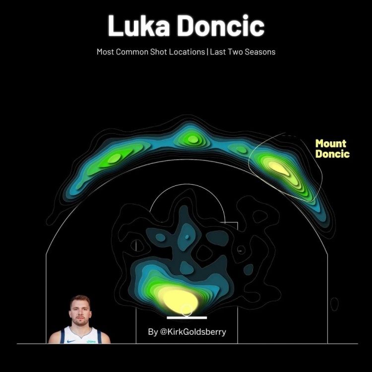 當(dāng)你繪制出東契奇最常見(jiàn)的投籃位置時(shí),有兩個(gè)熱點(diǎn):一個(gè)在籃筐附近,另一個(gè)是在三分線外左側(cè)45度處。這個(gè)外線熱點(diǎn)正是東契奇在周日的比賽中讓布勞恩上當(dāng)?shù)牡胤健@也是東契奇最喜歡的起舞的位置。