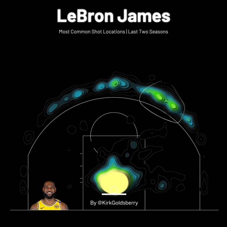 這與卡爾-馬龍和約翰-斯托克頓的情況不同。詹姆斯和東契奇都喜歡球場(chǎng)上的相同位置,兩人都偏愛(ài)三分線外左側(cè)45度以及突破至籃下。