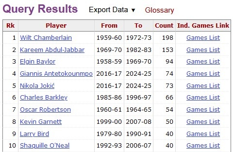 歷史25分15板5助場次榜:張伯倫198次一騎絕塵 字母哥75次第四