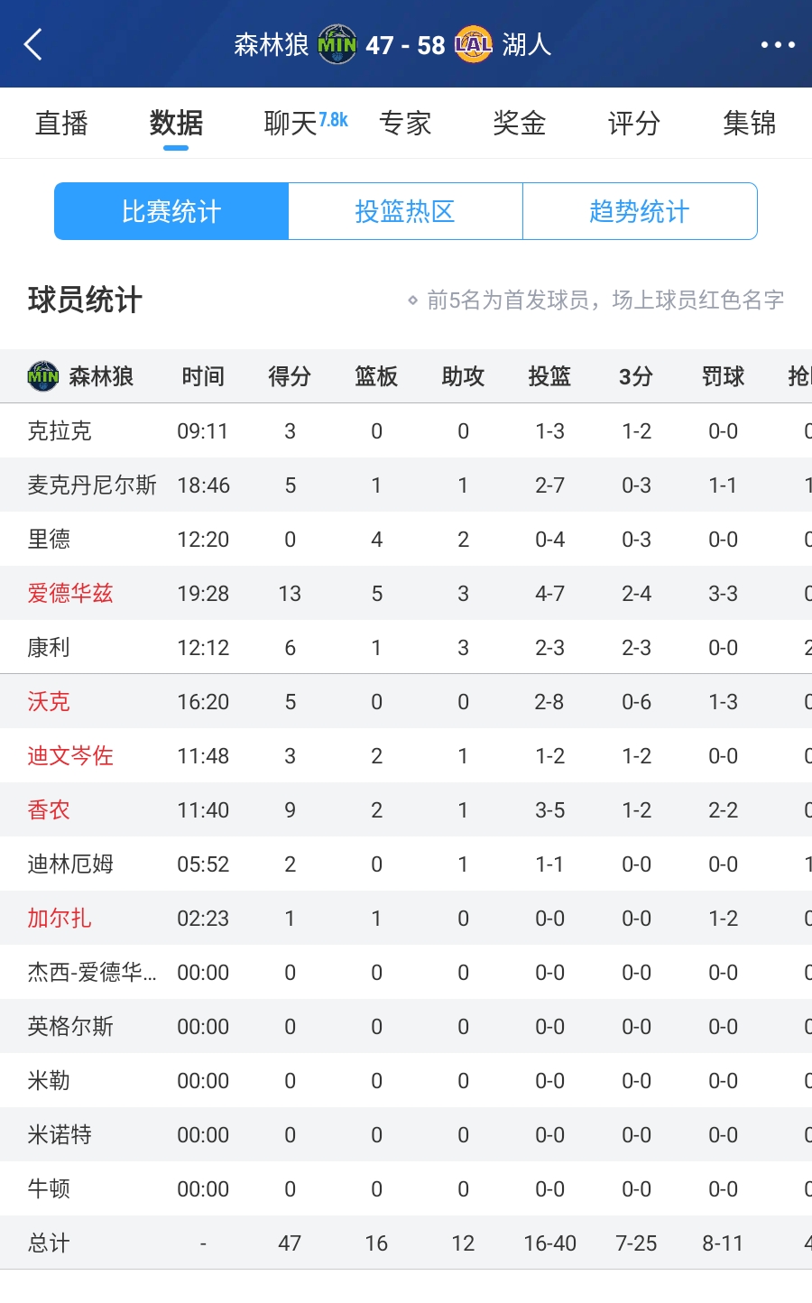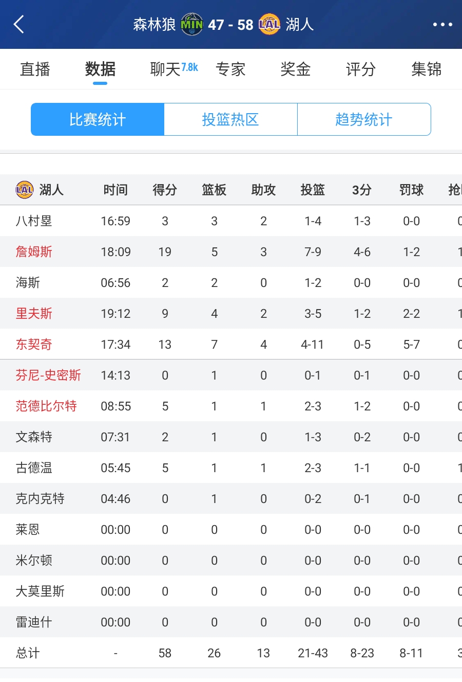 詹姆斯9中7高效19分5板3助 東契奇已筑三雙雛形 湖人半場領先11分