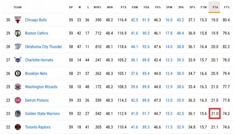 本場比賽過后,勇士賽季場均罰球數為21次,聯盟倒數第8。
