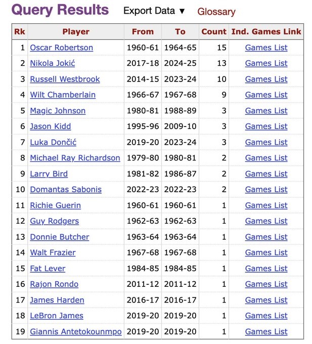 據(jù)統(tǒng)計,這是約基奇生涯第14場比賽至少15分15板15助攻,歷史第2多,距離歷史紀錄保持者大O僅差1次。