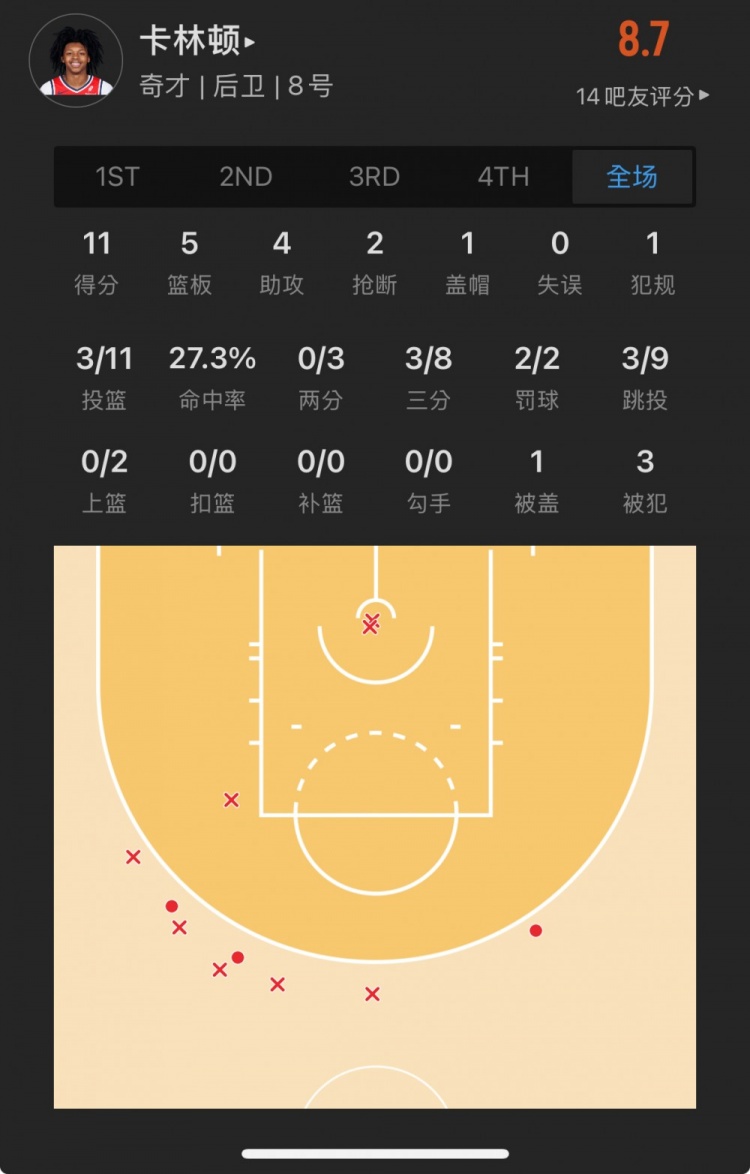 奇才14號(hào)秀 卡爾頓-卡林頓 登場(chǎng)31.8分鐘