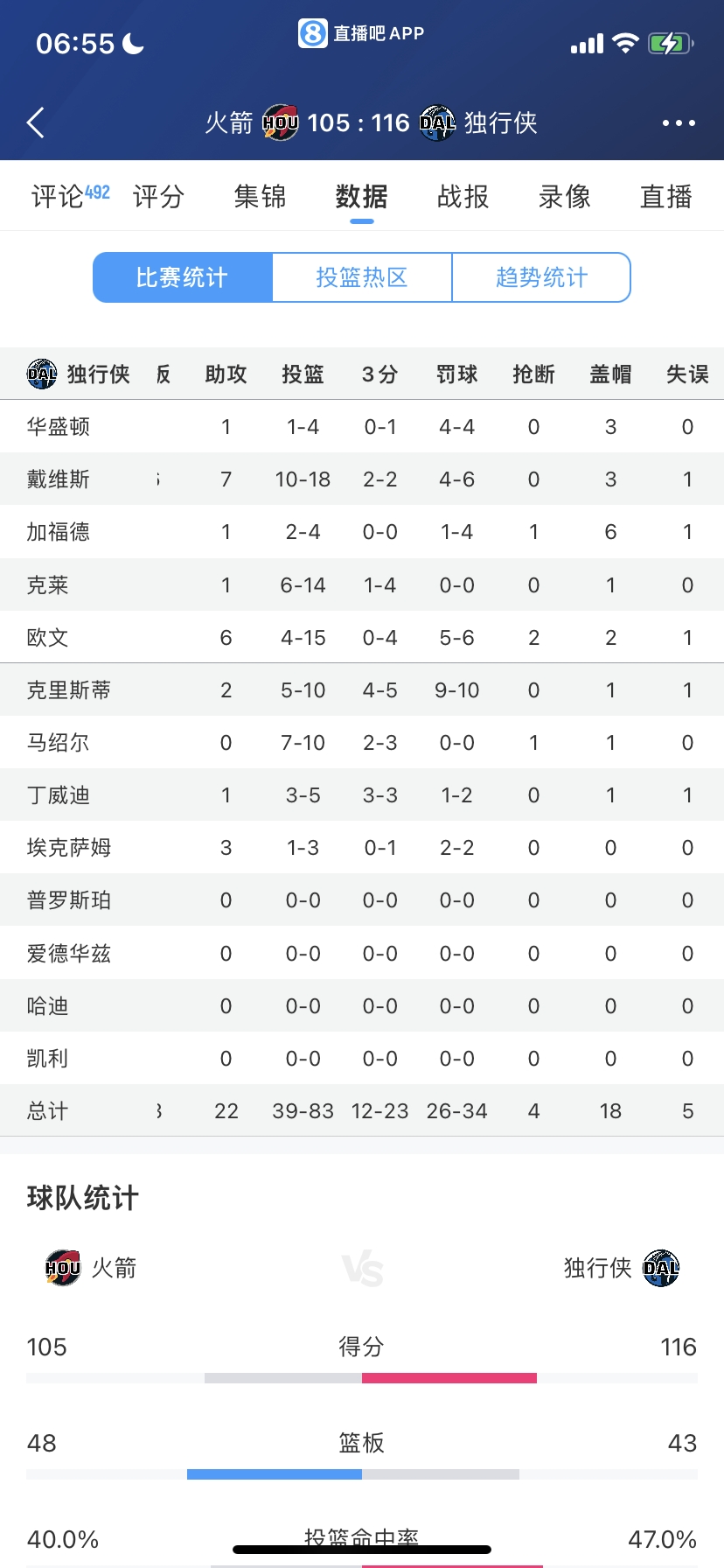 02月09日訊 NBA常規(guī)賽,獨行俠在主場以116-105拿下火箭,送給對手6連敗。