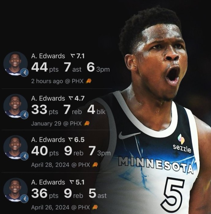 據(jù)統(tǒng)計,過去4場和太陽的交手(含2場季后賽),愛德華茲場均38.3分7.5板5.8助,進4.3記三分,三項命中率55/43/91%。