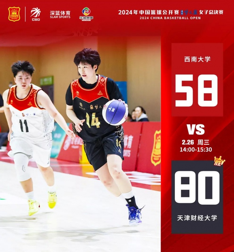 上半場首節(jié),兩隊打得相對膠著,比分緊咬。第二節(jié),西南大學(xué)手感欠佳,單節(jié)只得到9分。天津財經(jīng)大學(xué)則保持著不錯的進攻勢頭,單節(jié)拿到25分。半場結(jié)束,天津財經(jīng)大學(xué)37-24領(lǐng)先西南大學(xué)。下半場,西南大學(xué)7號應(yīng)茵、12號莫琇雅前后場籃板拼搶積極,但無奈前期存在一定差距,最終西南大學(xué)58-80不敵天津財經(jīng)大學(xué)。