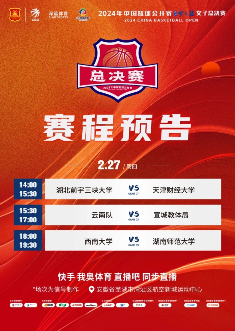 2月26日,2024年中國籃球公開賽洋河夢之藍女子總決賽繼續(xù)在安徽省蕪湖市灣沚區(qū)航空新城運動中心進行。在第二輪結(jié)束的三場比賽中,天津財經(jīng)大學(xué)、湖北前宇三峽大學(xué)收獲首場勝利,云南隊力克湖南師范大學(xué)取得兩連勝。