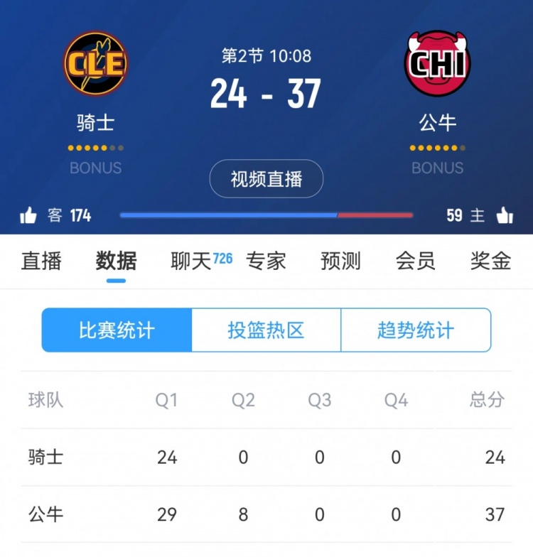 第二節(jié),公牛持續(xù)發(fā)力,2分鐘轟出8-0將優(yōu)勢擴大到13分,打停騎士。