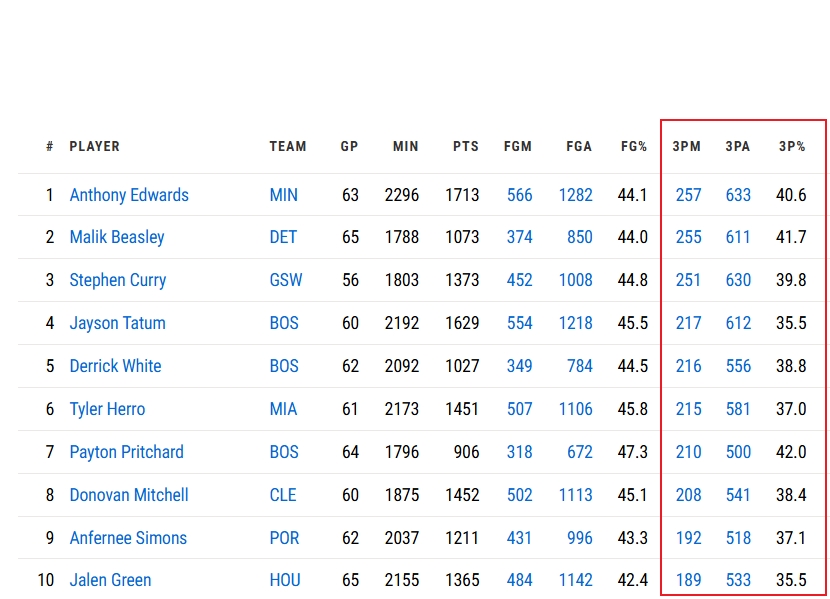聯(lián)盟三分榜,愛德華茲繼續(xù)位居榜首(257記),比斯利排名第二(255記),庫里今日之后超越250記,三分總數(shù)來到251記,迅速逼近。
