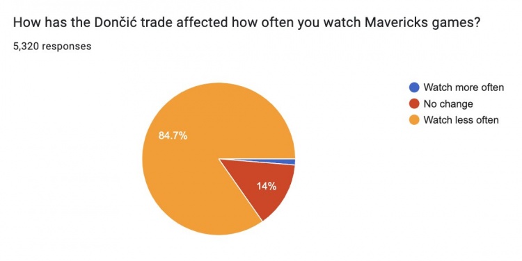 在東契奇交易如何影響你看獨(dú)行俠比賽這個(gè)問題上,84.7%的球迷表示已經(jīng)較少看獨(dú)行俠的比賽,14%的球迷表示沒有變化,只有1.3%的球迷表示自己看的更多了。
