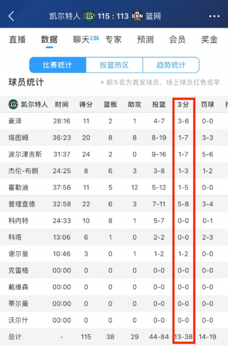 本場比賽,凱爾特人全隊三分整體來說有些失準,38投13中,命中率僅34.2%;除了普理查德(8中5)和豪澤(6中3)正常發(fā)揮外,其余人皆失常,僅24中5。
