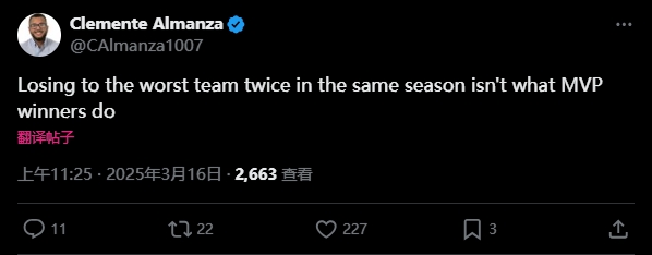 賽后,雷霆記者Clemente Almanza發(fā)推寫道:“同一個賽季兩次輸給聯盟最差的球隊,這可不是MVP該有的表現哦。”