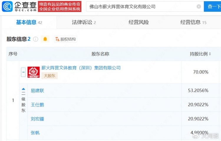 企查查APP顯示,易建聯(lián)關聯(lián)15家企業(yè),其中12家為存續(xù)狀態(tài),包括薪火陣營文體教育(深圳)集團有限公司、上海壹球成名信息技術有限公司等。此外,易建聯(lián)間接持股企業(yè)超200家,行業(yè)涉及除體育文化外,還包括商貿(mào)、科技、投資等領域。今年2月,易建聯(lián)關聯(lián)企業(yè)佛山市薪火陣營體育文化有限公司成被執(zhí)行人,執(zhí)行標的約12萬元。