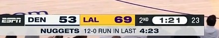 宕機(jī)了!湖人四分半一分沒得 被掘金打了一個(gè)12-0