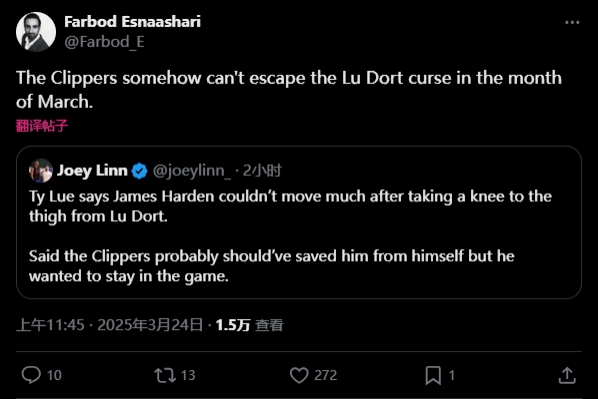 快船隊記Farbod Esnaashari發(fā)推表示:“快船在三月份似乎無法擺脫盧-多特的魔咒。”