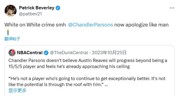今天,貝弗利則打臉帕森斯,轉發(fā)了后者曾說“里夫斯15+5+5就已經(jīng)到極限了”的言論,并寫道:“白人看不起白人,無語了,像個男人一樣出來道歉!”