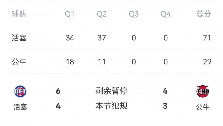 大人打小孩?活塞半場(chǎng)5人得分上雙 71-29領(lǐng)先公牛42分