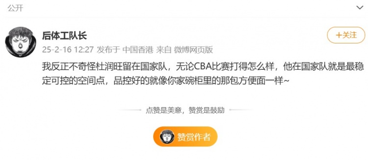 媒體人@后體工隊(duì)長(zhǎng)發(fā)微博對(duì)此發(fā)表看法,他寫(xiě)道:“我反正不奇怪杜潤(rùn)旺留在國(guó)家隊(duì),無(wú)論CBA比賽打得怎么樣,他在國(guó)家隊(duì)就是最穩(wěn)定可控的空間點(diǎn),品控好的就像你家碗柜里的那包方便面一樣~??”