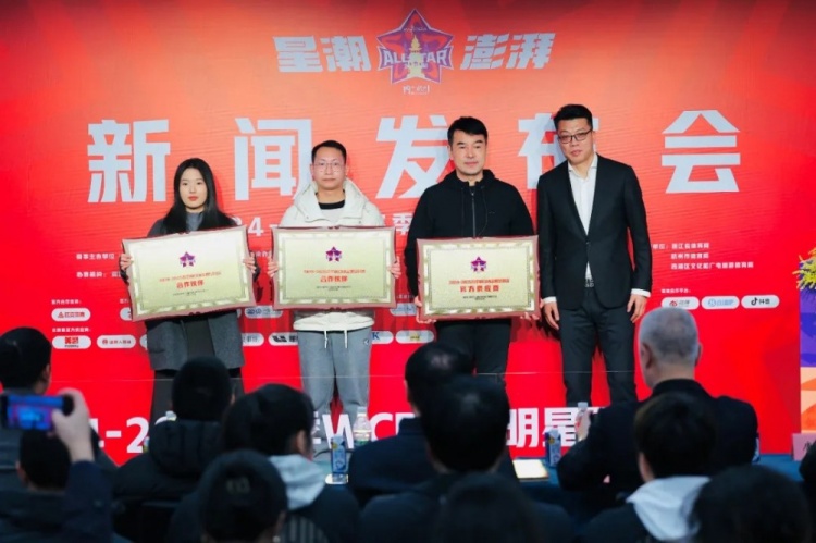發(fā)布會最后,深籃體育(北京)有限公司W(wǎng)CBA項目負(fù)責(zé)人楊潤章和浙江蕞紅體育文化策劃有限公司董事長楊笑一起,為全明星周末贊助商代表舉行了授牌儀式。