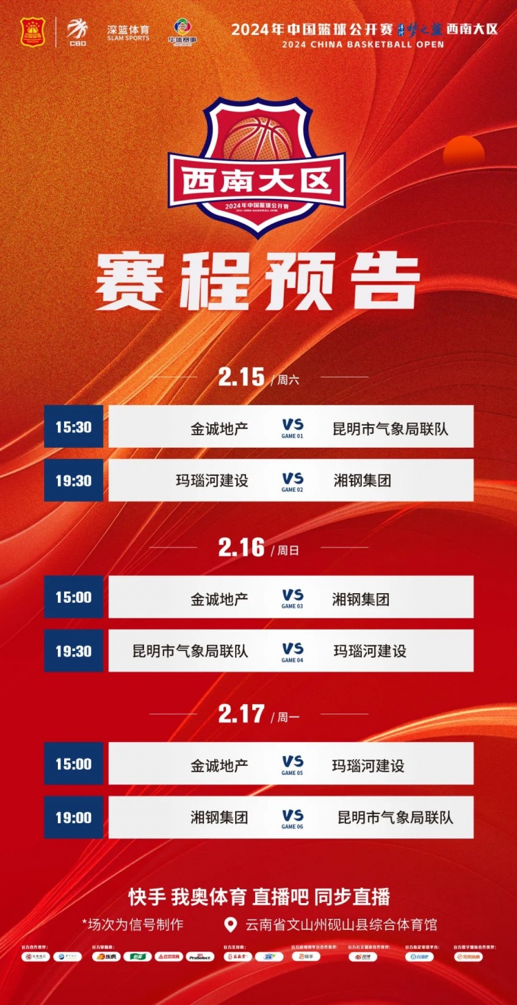 2月15日-17日,2024年中國籃球公開賽洋河夢之藍西南大區(qū)賽將在云南省文山州硯山縣綜合體育館舉辦,來自西南賽區(qū)各省市的4支男籃隊伍將在文山硯山激烈爭奪通往全國總決賽的入場劵。新年伊始,齊聚文山,誰能在這場激烈競爭中突出重圍,捧起通過全國總決賽的希望之鑰,讓我們拭目以待!