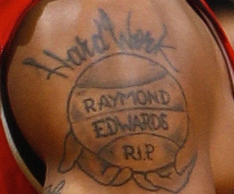 “如果我不打籃球的話,舅舅不會開心的。同時,我要承擔起責任,成為一家之主?!彼诩绨蛏衔牧艘粋€文身,在一雙祈禱的手上,刻著“努力工作”這幾個字,雙手握著一個籃球,籃球上寫著,“雷蒙德-愛德華茲,RIP”,努力工作、祈禱和籃球,這是他和舅舅之間,最牢不可破的紐帶。