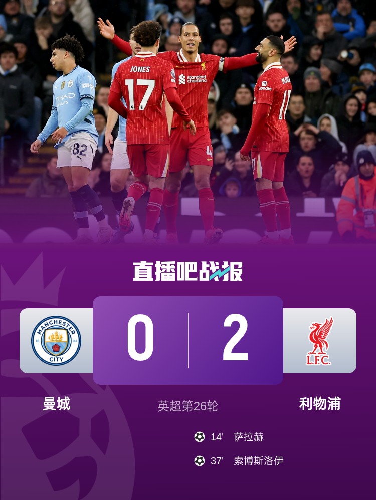 英超第26輪,利物浦2-0雙殺曼城。上半場(chǎng),劉易斯失誤送角球致丟球,薩拉赫和索博斯洛伊互獻(xiàn)傳射,馬爾穆什進(jìn)球越位;下半場(chǎng),瓊斯進(jìn)球越位在先。