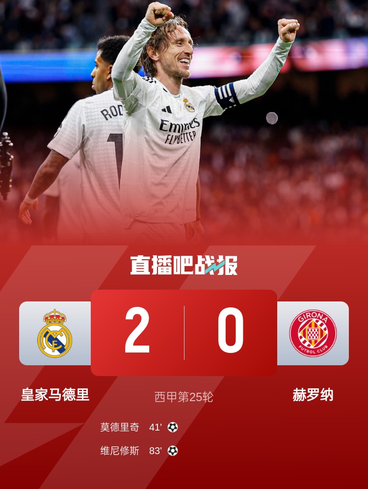近4輪首勝!皇馬2-0赫羅納追平榜首 莫德里奇世界波維尼修斯破門(mén)