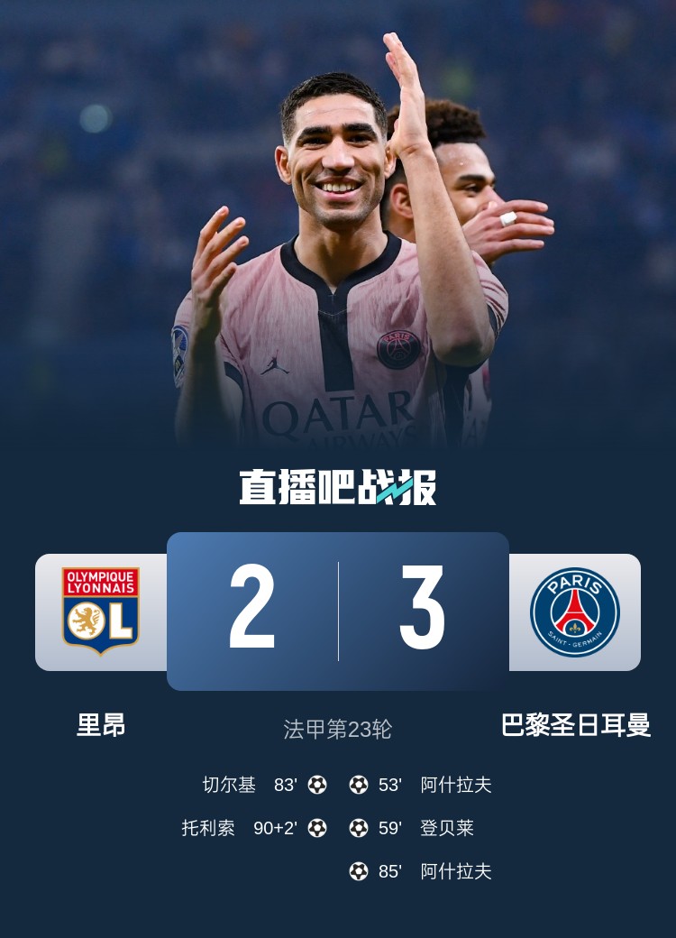 法甲第23輪,巴黎圣日耳曼3-2里昂。上半場(chǎng),阿什拉夫犯規(guī)染黃,雙方互交白卷;下半場(chǎng),阿什拉夫打入兩球上演梅開(kāi)二度,登貝萊破門(mén)打入個(gè)人聯(lián)賽第17球,切爾基和托利索為里昂扳回兩球。