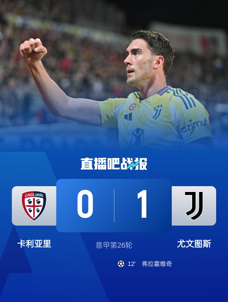 意甲第26輪,尤文1-0卡利亞里,聯(lián)賽4連勝。上半場(chǎng),弗拉霍維奇過(guò)掉門(mén)將小角度破門(mén);下半場(chǎng),坎比亞索傷退,替補(bǔ)出場(chǎng)僅20分鐘的道格拉斯-路易斯也傷退。