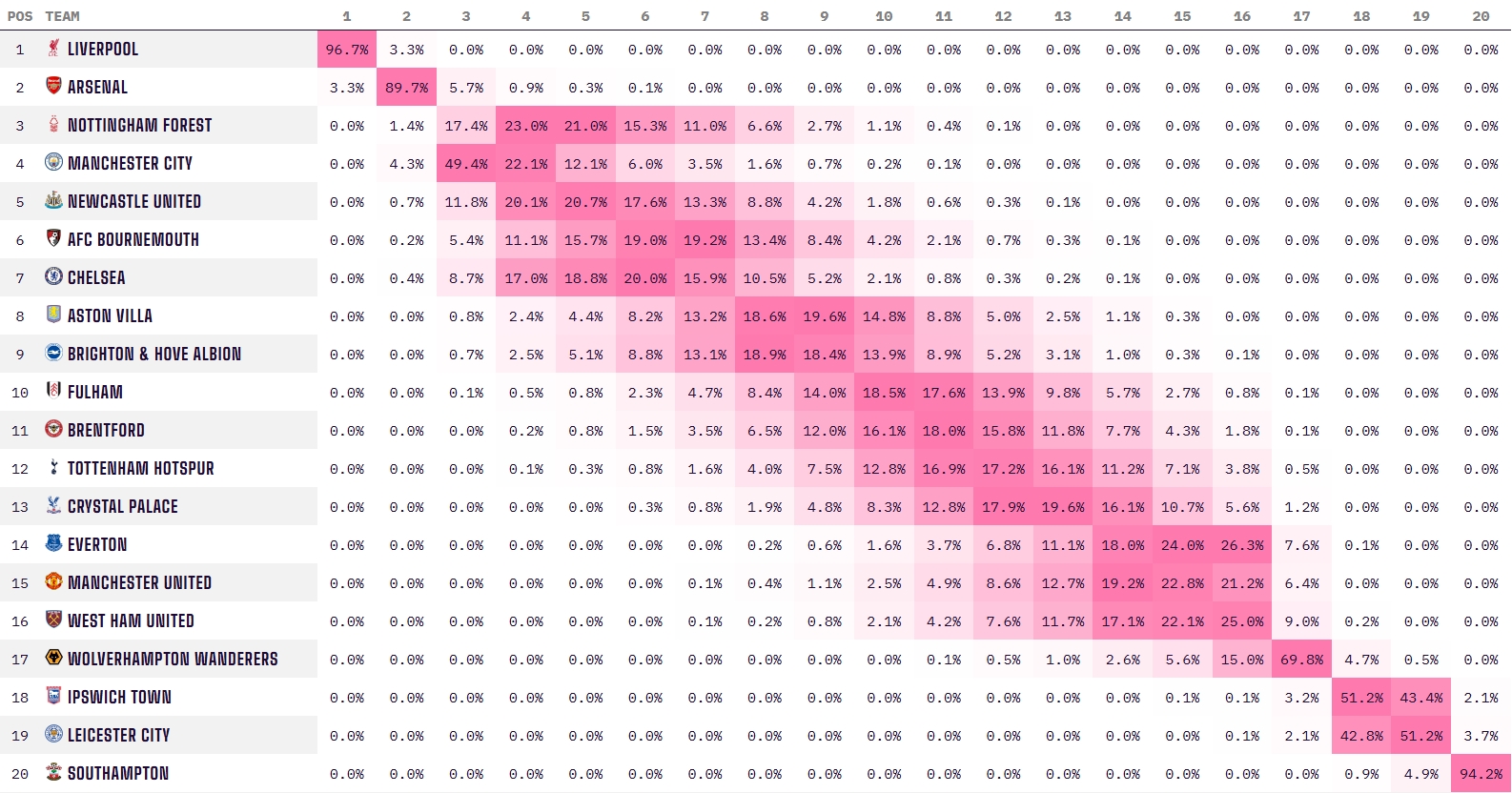 穩(wěn)了??利物浦最新英超奪冠概率高達96.7%,阿森納3.3% 曼城歸0