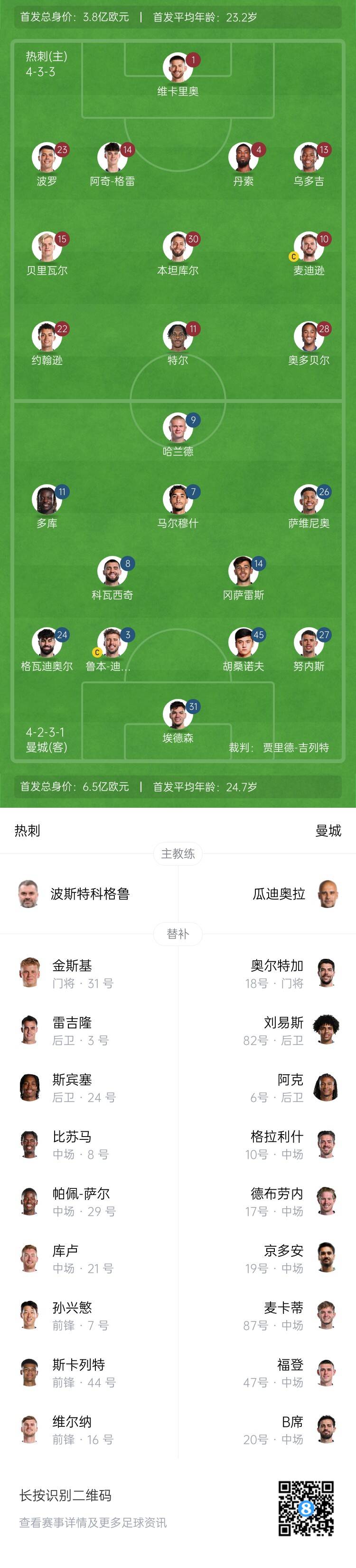 熱刺vs曼城首發(fā):孫興慜替補,哈蘭德、馬爾穆什、多庫出戰(zhàn)