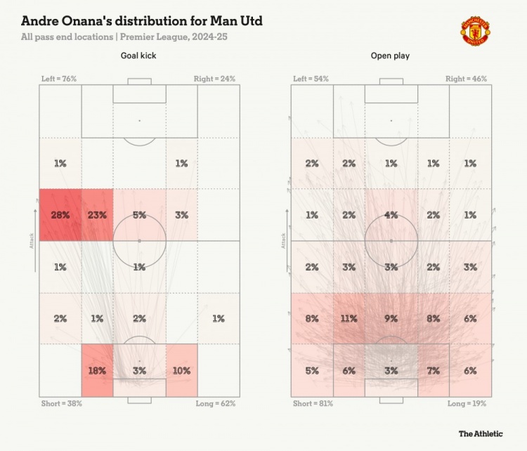 問題似乎在進攻組織的早期階段就已經出現(xiàn),從奧納納開始就是如此。曼聯(lián)似乎還沒有找到他最適合的出球方式——盡管現(xiàn)在有點兒趨勢了。本賽季,無論是在滕哈赫,還是在阿莫林麾下,奧納納經常會采用長傳球的方式出球,如下圖所示。
