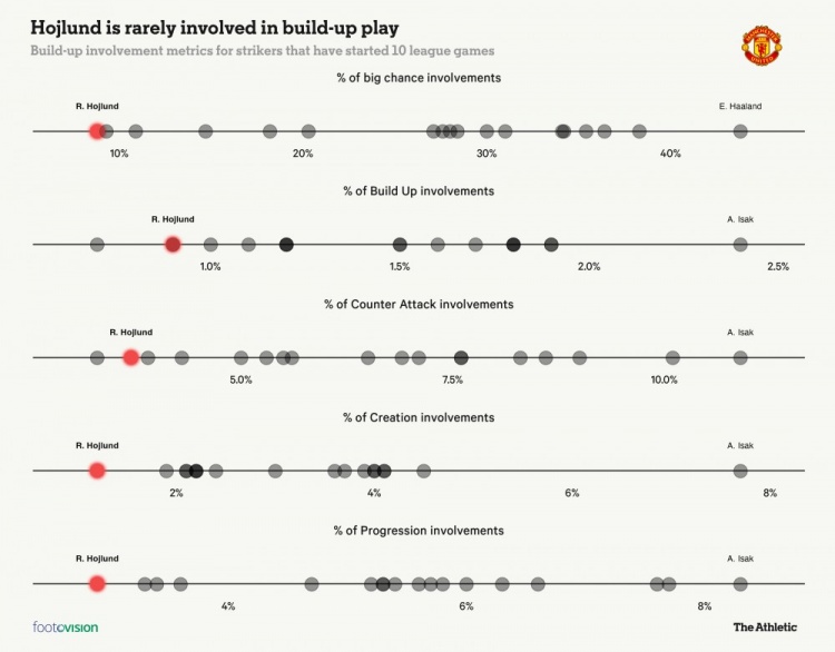 來自Footovision的數(shù)據(jù),進一步突顯了霍伊倫在比賽中缺乏參與度。本賽季到目前為止,比賽首發(fā)過半數(shù)的英超前鋒中,霍伊倫的進攻組織參與度只有1.3%,這突顯了他在進攻組織階段幾乎是可有可無。