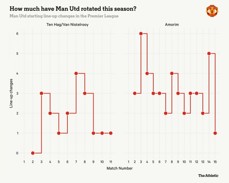 在對陣埃弗頓的比賽中,阿莫林的首發(fā)名單中只有一個位置進行了調整,這也是他15場聯(lián)賽中調整最小的一次。
