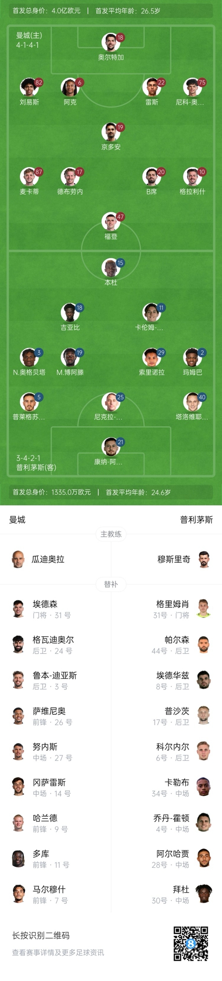 曼城首發(fā):18-奧爾特加、82-劉易斯、22-雷斯、6-阿克、75-奧賴?yán)?9-京多安、17-德布勞內(nèi)、87-麥卡蒂、20-B-席爾瓦、10-格拉利什、47-福登