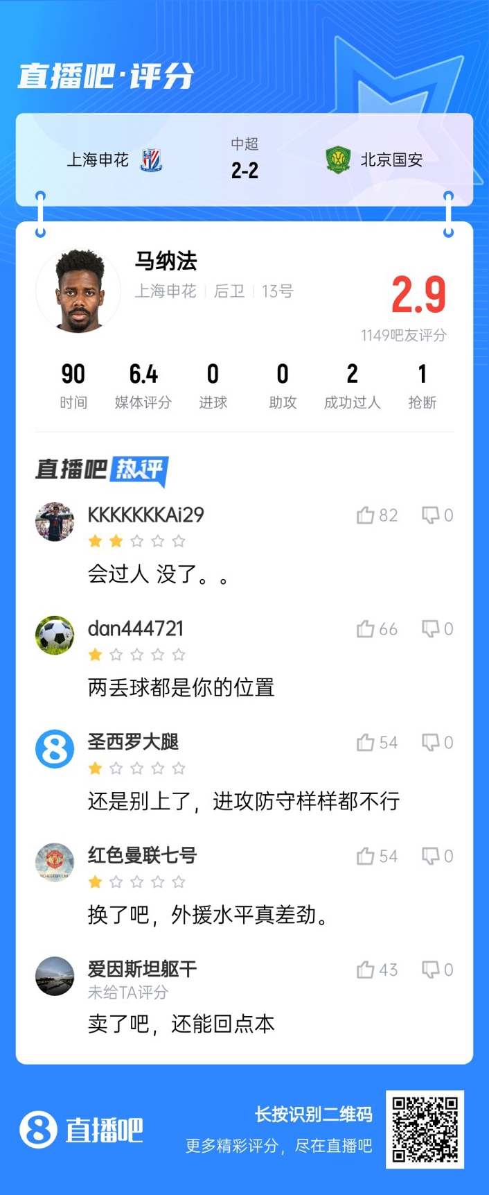 昨晚的京滬德比中,申花右后衛(wèi)馬納法與兩粒丟球都有關系。補時階段沒能防住李磊,后者強行起球助攻阿布雷烏完成絕平。