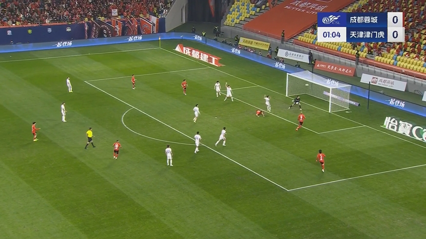 03月02日訊 中超第二輪,成都蓉城vs天津津門虎,比賽第2分鐘,周定洋開場1分鐘門前墊射,可惜皮球打在橫梁彈出。