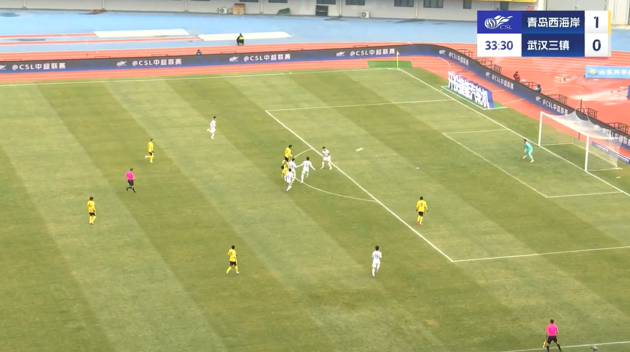 上半場(chǎng)補(bǔ)時(shí)3分鐘,青島西海岸1-0武漢三鎮(zhèn)。