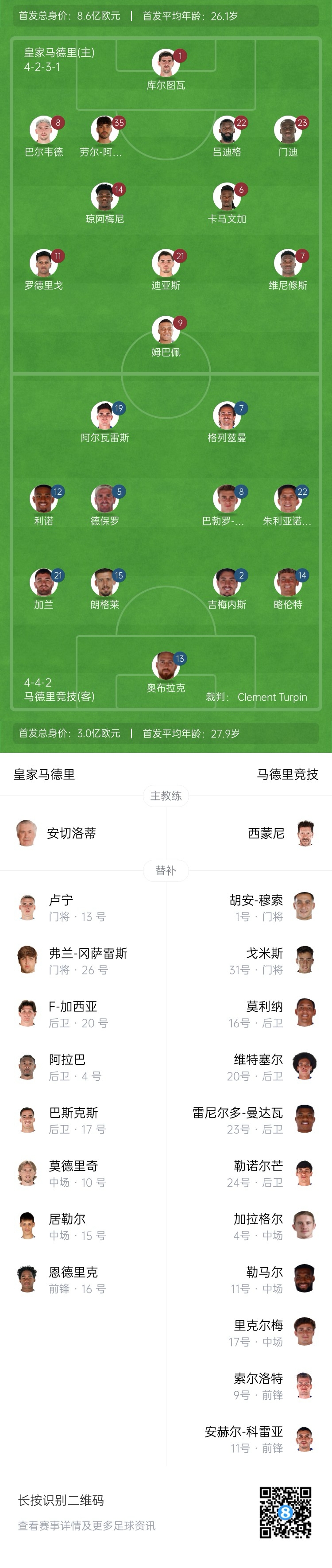 皇馬vs馬競(jìng)首發(fā):姆巴佩、維尼修斯先發(fā),阿爾瓦雷斯、格子出戰(zhàn)