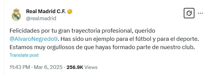 皇馬官方:祝賀內格雷多有著偉大的生涯,為你曾是我們一員而自豪