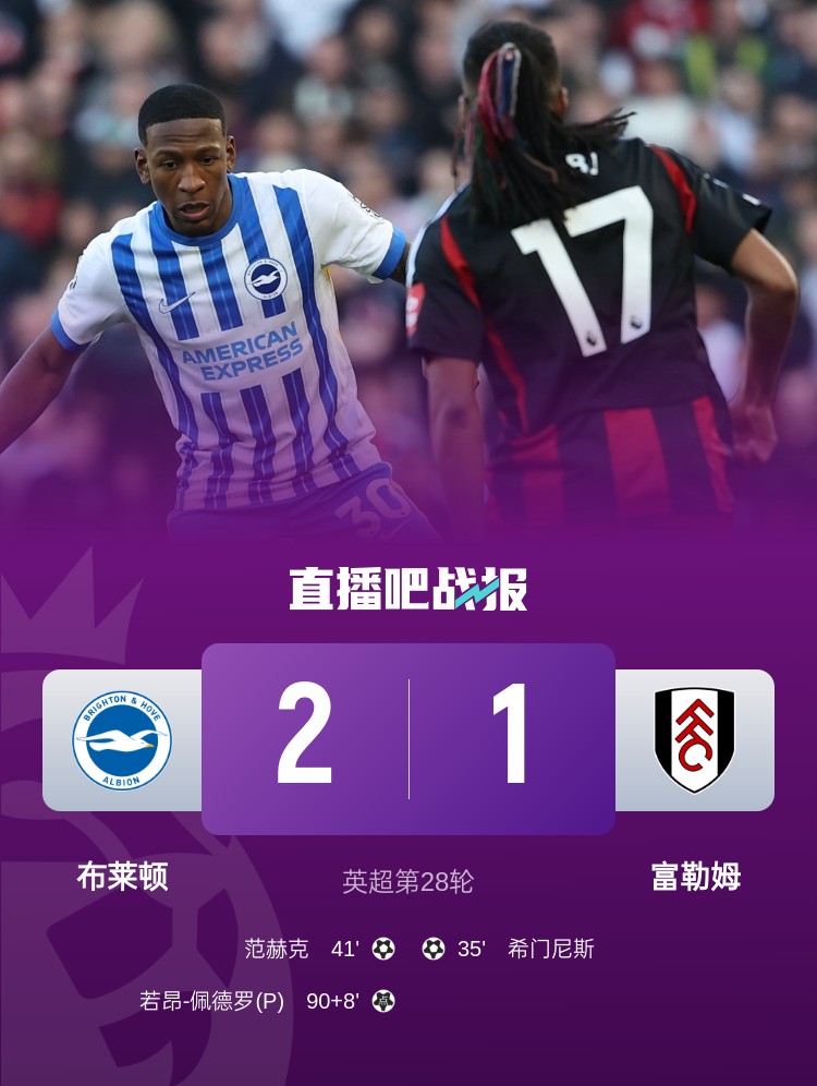 英超第28輪,布萊頓2-1逆轉(zhuǎn)富勒姆。上半場(chǎng),希門尼斯首開記錄,伊沃比助攻,范赫克冒頂后將功補(bǔ)過扳平;下半場(chǎng),三笘薰進(jìn)球越位,佩德羅讀秒造點(diǎn)+點(diǎn)射絕殺。