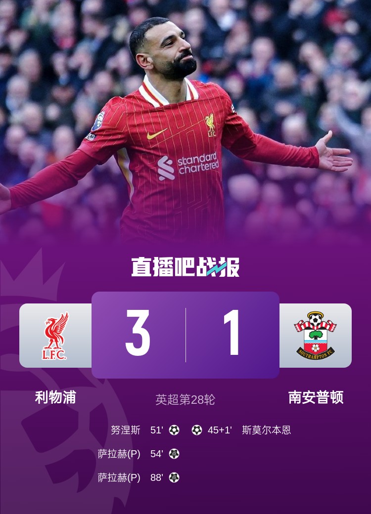 英超第28輪,利物浦3-1逆轉(zhuǎn)南安普頓。上半場(chǎng),利物浦防線出現(xiàn)失誤,斯莫爾伯恩破門;下半場(chǎng),努涅斯破門+造點(diǎn),薩拉赫點(diǎn)射,菅原由勢(shì)手球送點(diǎn),薩拉赫點(diǎn)射再中。