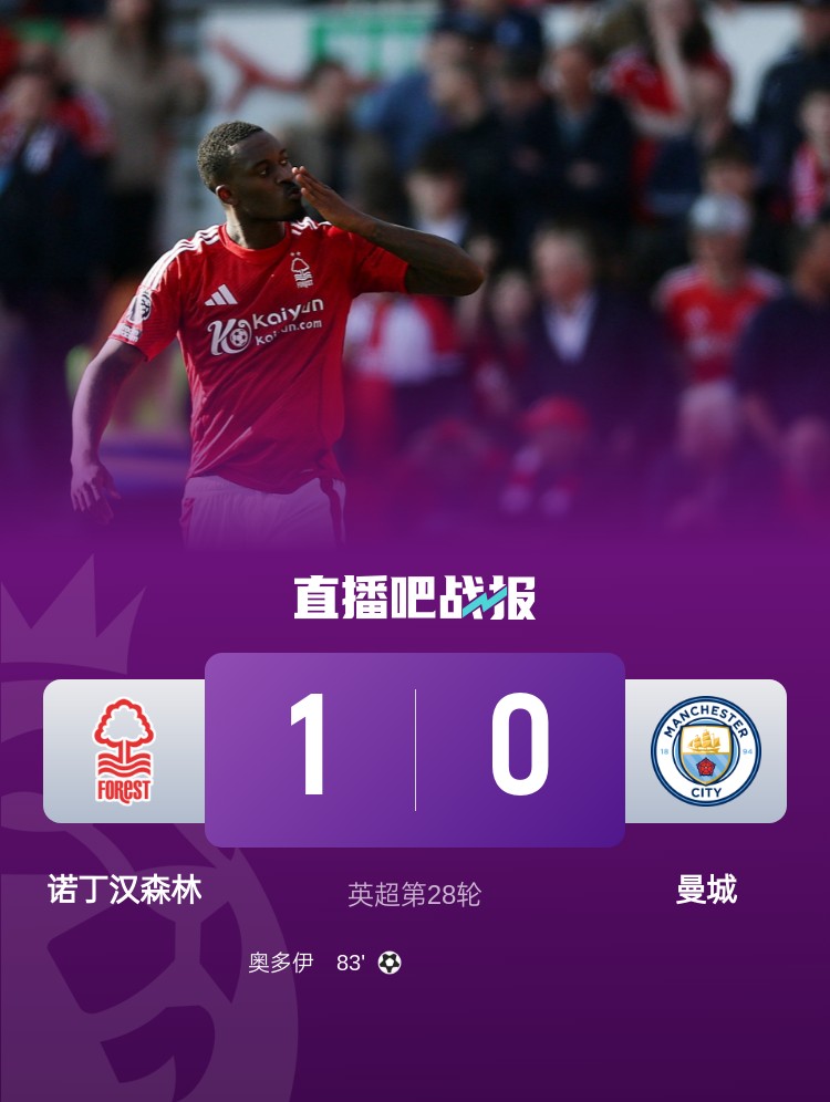 遭絕殺! 曼城0-1森林先賽仍第4 森林終結(jié)對(duì)曼城三連敗奧多伊制勝