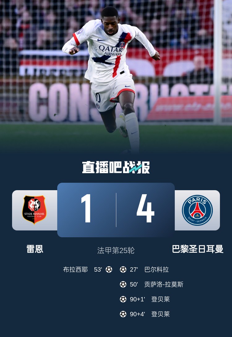 法甲第25輪,巴黎4-1大勝雷恩。上半場(chǎng),巴爾科拉破門,隨后故意手球未吃牌,半場(chǎng)補(bǔ)時(shí)假摔最終領(lǐng)到黃牌;下半場(chǎng),巴爾科拉助攻G-拉莫斯破門,布拉西耶扳回一球,登貝萊替補(bǔ)登場(chǎng)補(bǔ)時(shí)雙響。