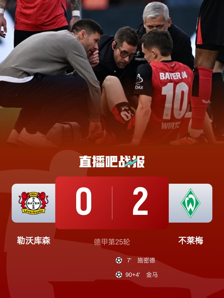 德甲第25輪,勒沃庫(kù)森0-2不敵不萊梅,結(jié)束23輪不敗。上半場(chǎng),斯塔格助攻施密德破門,維利科維奇進(jìn)球被吹越位,阿萊克斯-加西亞任意球中框;下半場(chǎng),替補(bǔ)登場(chǎng)的維爾茨傷退,伯克打入一球被吹越位,金馬鎖定勝局。