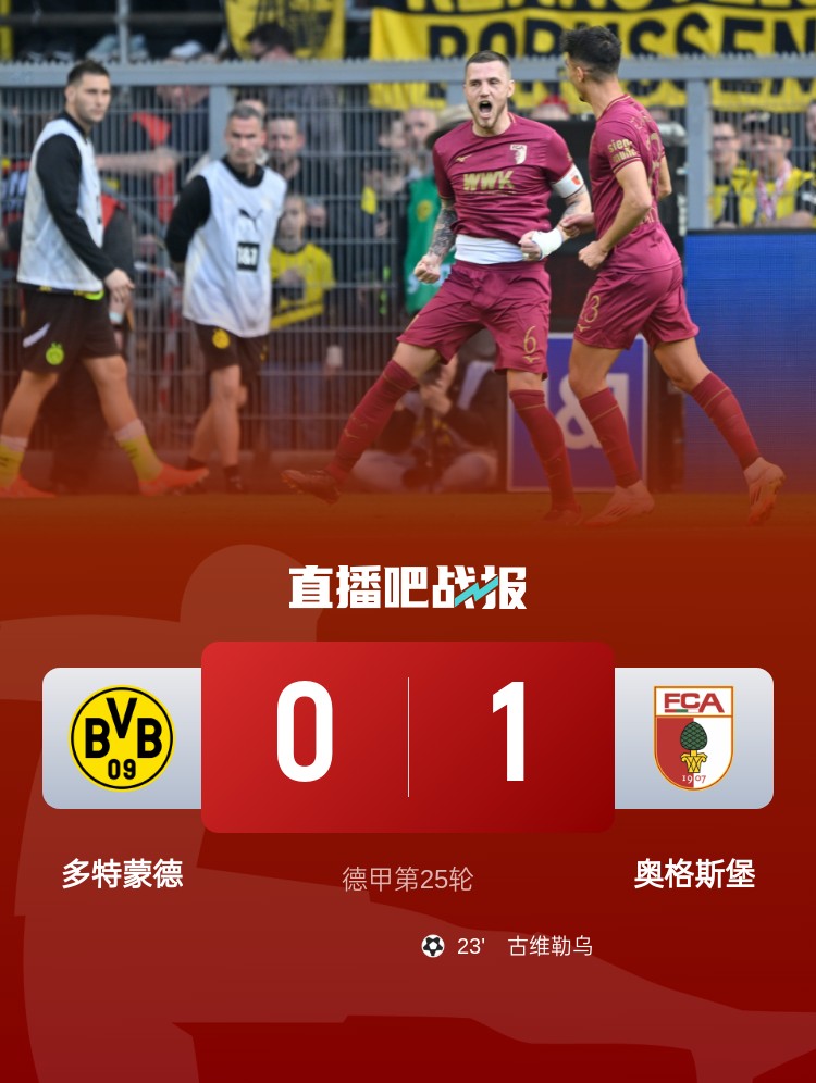 德甲第25輪,多特主場(chǎng)0-1不敵奧格斯堡。上半場(chǎng),古維勒烏頭球吊射破門;下半場(chǎng),布蘭特破門但越位在先,厄茲詹自擺烏龍但古維勒烏越位在先,埃森德破門但亞基奇越位。