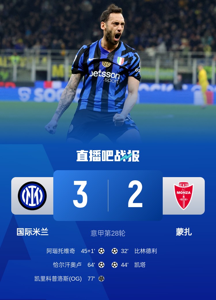 意甲第28輪,國(guó)米3-2逆轉(zhuǎn)蒙扎。上半場(chǎng),勞塔羅破門被吹無效,圖拉精彩撲救,比林德利首開記錄,凱塔遠(yuǎn)射世界波,阿瑙托維奇扳回一城;下半場(chǎng),恰爾漢奧盧凌空抽射扳平,勞塔羅頭球造烏龍,小圖拉姆推射中柱。