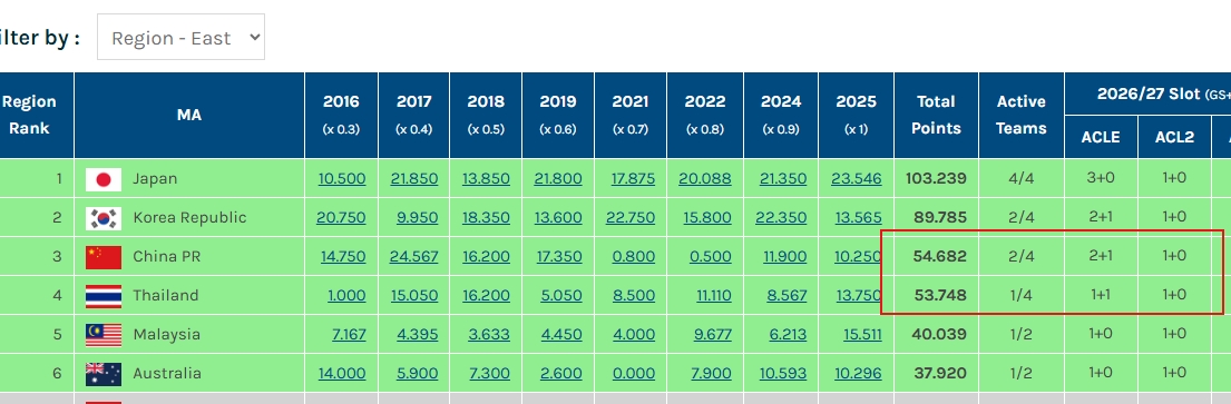在泰山退賽情況下,目前中超球隊在亞冠賽場僅剩海港、申花兩隊爭取技術(shù)分。目前中國積分為54.682,身后泰國積53.748分虎視眈眈。一旦中國被泰國超越,那么26/27亞冠精英聯(lián)賽的名額將縮減為1+1。